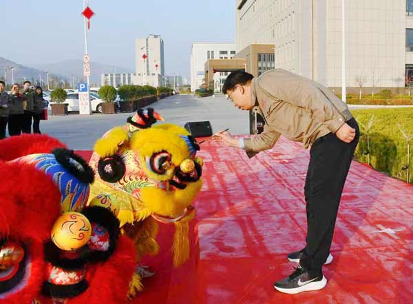 致辭結(jié)束后,高管向全體職工發(fā)放新春開工紅包。隨后,舞獅表演拉開帷幕。雄獅威武靈動(dòng)、氣勢昂揚(yáng),騰躍起舞間盡顯勃勃生機(jī)。包廣利董事長為醒獅點(diǎn)睛:“一點(diǎn)左眼金光閃閃,二點(diǎn)右眼銀光燦燦,三點(diǎn)額頭開門大吉,四點(diǎn)獅嘴財(cái)源廣進(jìn)。”點(diǎn)睛儀式寓意喚醒瑞獸、賜福企業(yè),祝愿新的一年海林公司宏圖大展、蒸蒸日上、財(cái)源廣進(jìn)、基業(yè)長青。