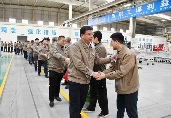在熱烈的掌聲與歡呼聲中,公司領(lǐng)導(dǎo)班子與醒獅隊(duì)伍踏著喜慶的節(jié)拍,依次前往公司四大分廠、內(nèi)外銷庫房、配送中心及辦公樓大廳巡場拜年。他們與一線職工親切握手、暖心互動(dòng)、送福納祥,將新春的美好祝愿送到每一個(gè)崗位、每一位員工心中。在內(nèi)外銷庫房及配送中心門前,包廣利董事長專程與負(fù)責(zé)運(yùn)送企業(yè)新春首批貨物的貨車司機(jī)師傅們一一握手,為他們送上新年紅包與新春祝福,向堅(jiān)守運(yùn)輸一線、保障企業(yè)物流暢通的駕駛員們致以誠摯慰問。現(xiàn)場職工個(gè)個(gè)笑容滿面、暖意融融,處處洋溢著家一般的溫馨與奮進(jìn)的朝氣。