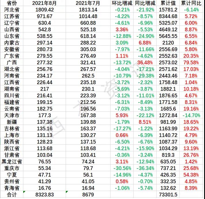 據(jù)中鋼協(xié)最新數(shù)據(jù)顯示,9月中旬重點(diǎn)鋼企粗鋼日均產(chǎn)量199.14萬噸,環(huán)比下降2.62%。據(jù)數(shù)據(jù),截至2021年8月份,國(guó)內(nèi)月度粗鋼產(chǎn)量已連續(xù)三個(gè)月大幅下滑。在全國(guó)范圍的政策壓制下,多數(shù)省市粗鋼產(chǎn)量同比和環(huán)比雙降,具體如下圖: