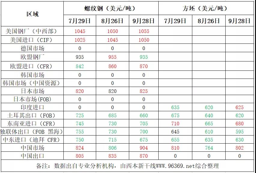 根據(jù)西本資訊統(tǒng)計(jì)的數(shù)據(jù)(如上表)顯示,9月份國(guó)際螺紋鋼漲跌互現(xiàn),中國(guó)建筑鋼出口不具備明顯的價(jià)格優(yōu)勢(shì)。